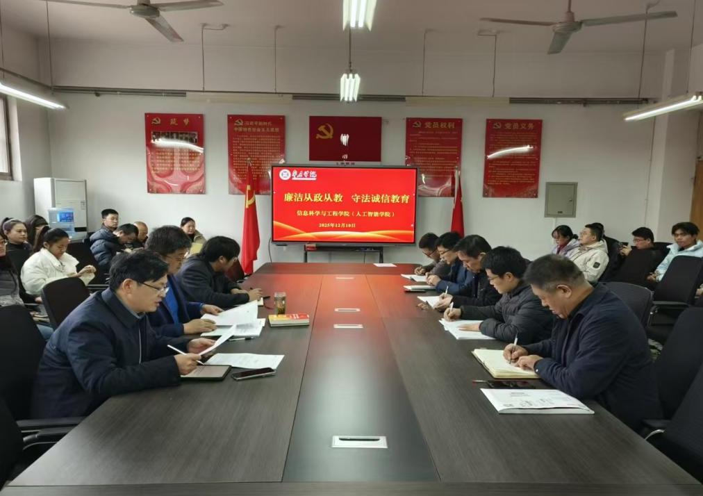为深入贯彻落实全面从严治党要求,切实强化师德师风建设,筑牢全体教职工廉洁从教、依法履职的思想根基,12月10日下午,信息科学与工程学院(人工智能学院)于理工楼2121会议室召开“廉洁从政从教,守法诚信教育”全体教职工大会,学院党委书记姬广华主持。