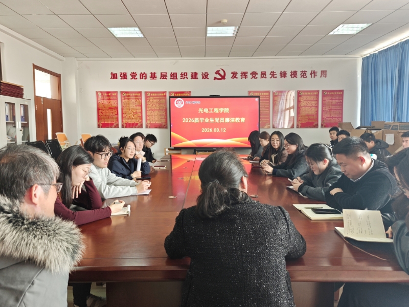 为进一步加强毕业生党员党性修养,筑牢廉洁自律思想防线,引导广大毕业生党员扣好职业生涯“第一粒扣子”,3月12日,光电工程学院在学院会议室召开2026届毕业生党员廉洁教育大会。毕业生党员和毕业生辅导员参加本次会议。
